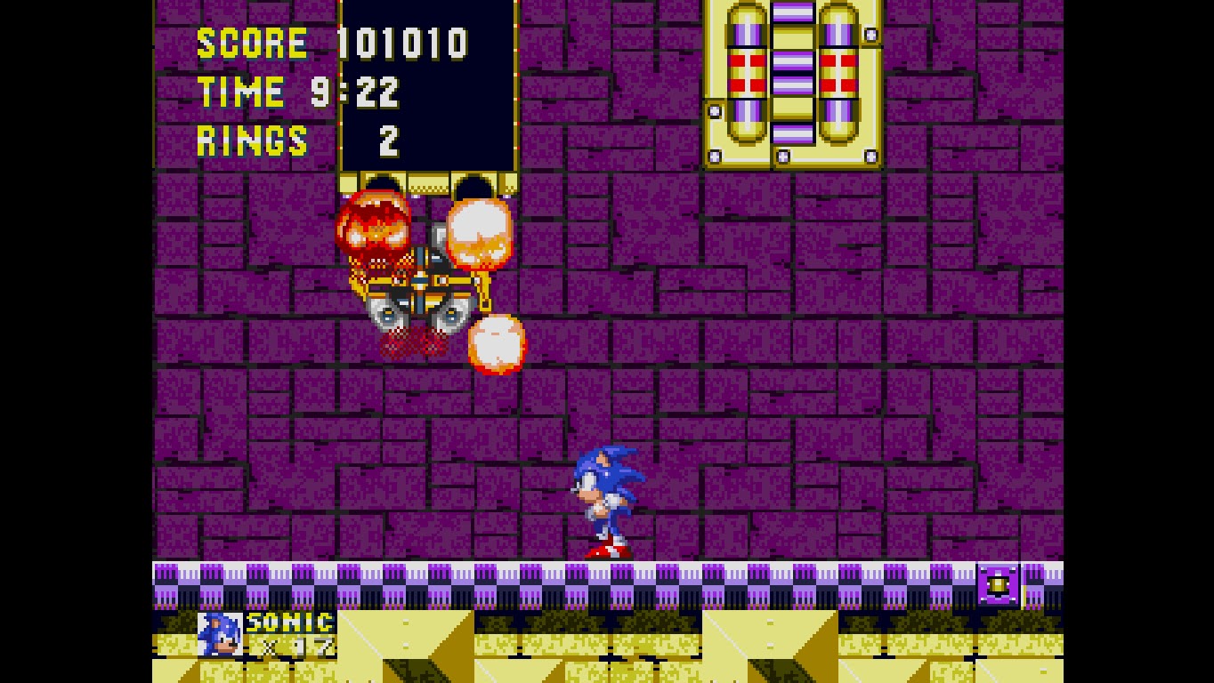 In this battle we have to chase Robotnik through an obstacle course while catching up to him and hitting him. When he's shooting out flames from his exhausts it means he's moving away from you and I'm sure it hurts you as well. This always reminds me of those Crash Banicoot levels where you have to run away from giant boulders...except I am the giant boulders!